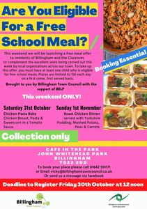 This weekend we will be launching a free meal offer to residents of Billingham and the Clarences to complement the excellent work being carried out this week by local organisations across our town. To take up this offer, you must have at least one child who is eligible for free school meals. Places are limited to 150 each day on a first-come, first-served basis.